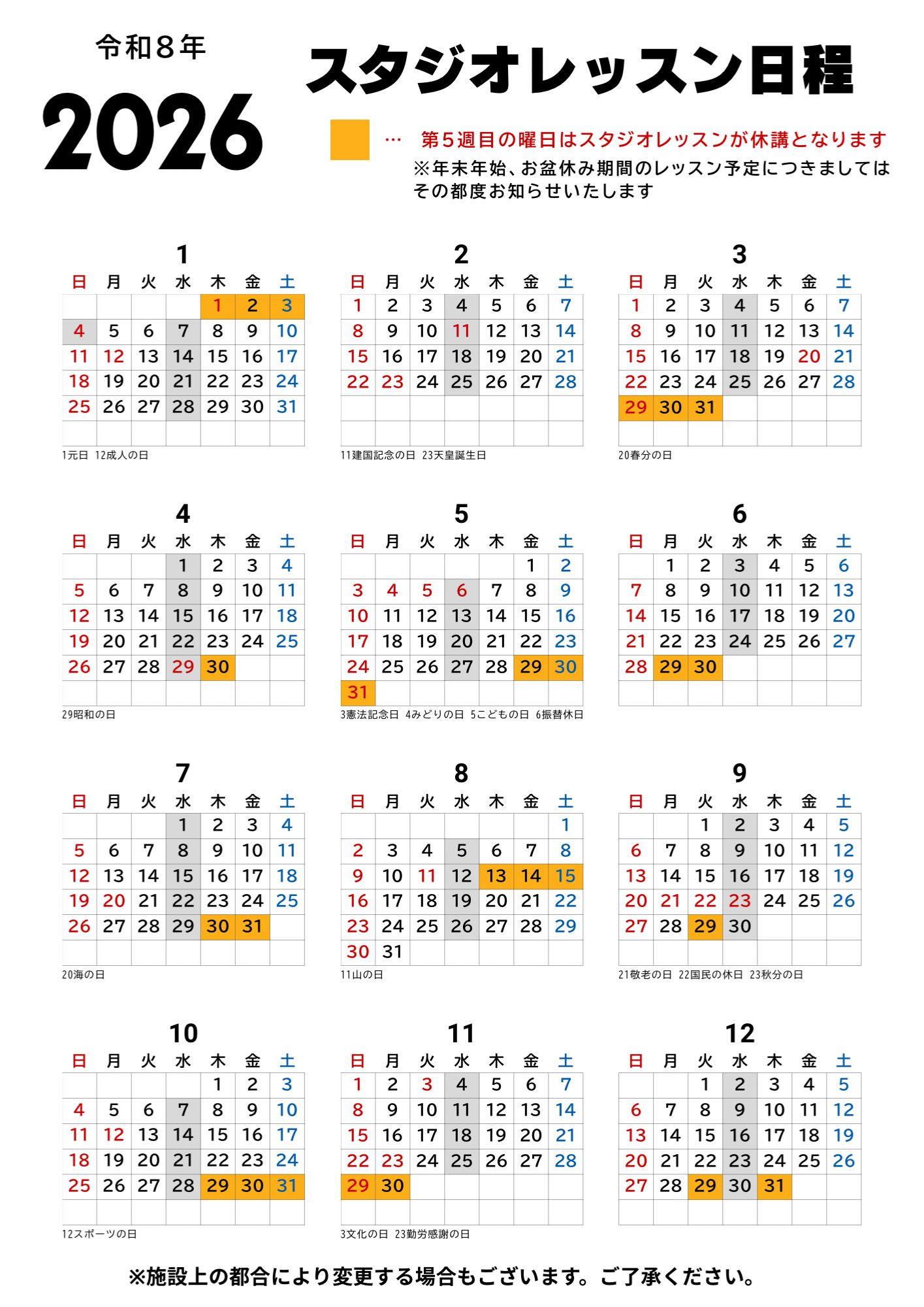 2026年スタジオレッスン日程